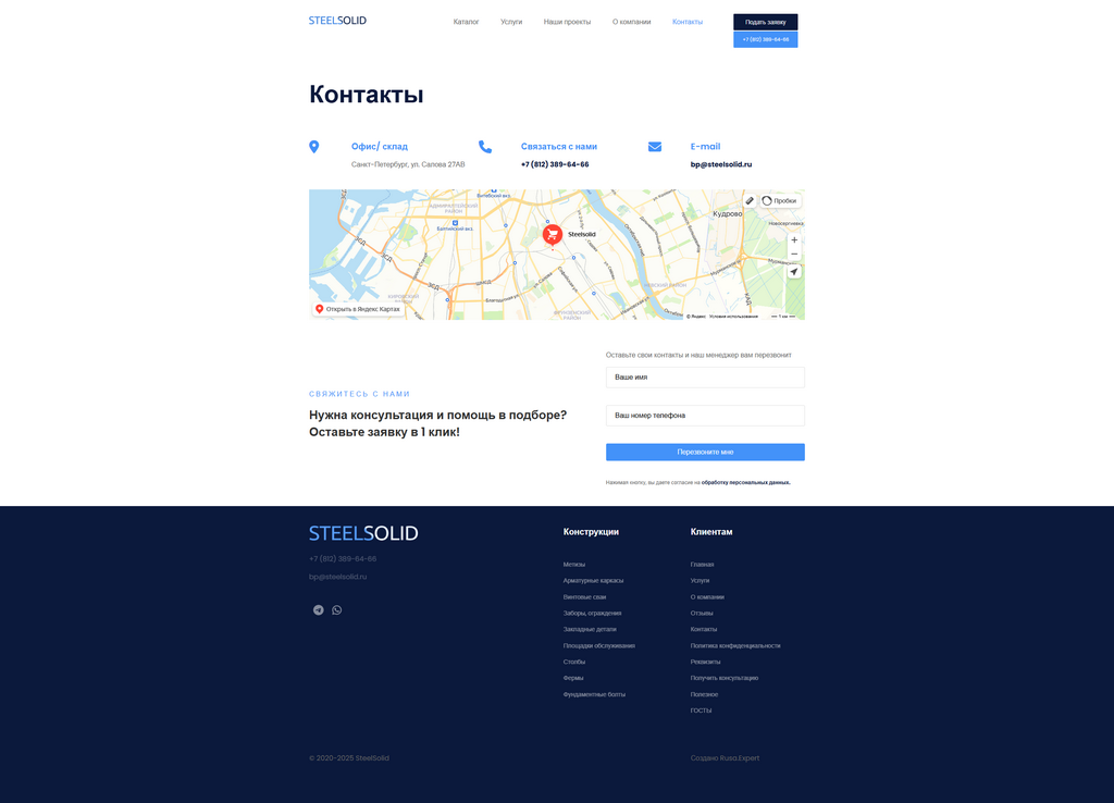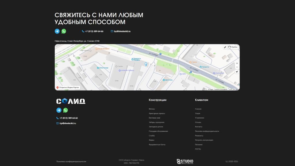 Для конверсии этот блок работает как финальное подтверждение: компания открыта, с ней легко выйти на контакт, есть реальный адрес и разные каналы связи. Всё это снижает сомнения и подталкивает к решению "позвоню или напишу прямо сейчас".