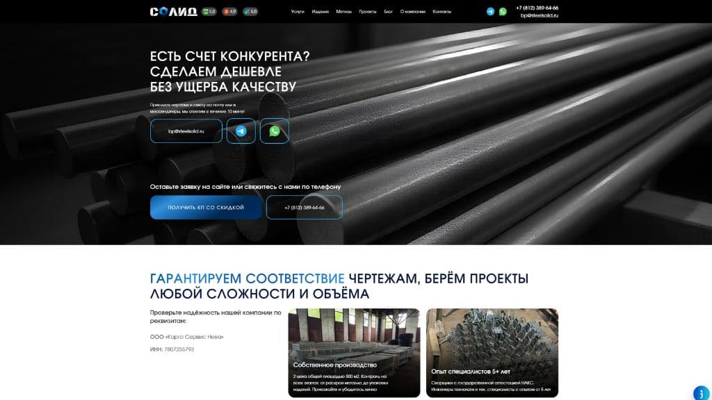 Здесь мы усиливаем предложение компании максимально простым и понятным оффером: если у клиента уже есть коммерческое предложение от конкурента, Солид сделает дешевле, но без потери качества. Такой ход напрямую бьёт в главный критерий выбора для большинства предпринимателей - цена.