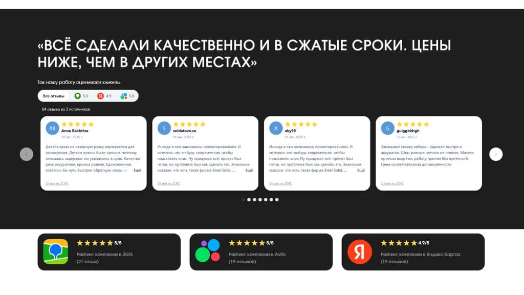 Отдельный блок с рейтингами на независимых платформах (2ГИС, Avito, Яндекс) усиливает эффект доверия. Клиент видит: это не просто отзывы на сайте, а подтверждение репутации в открытых источниках.