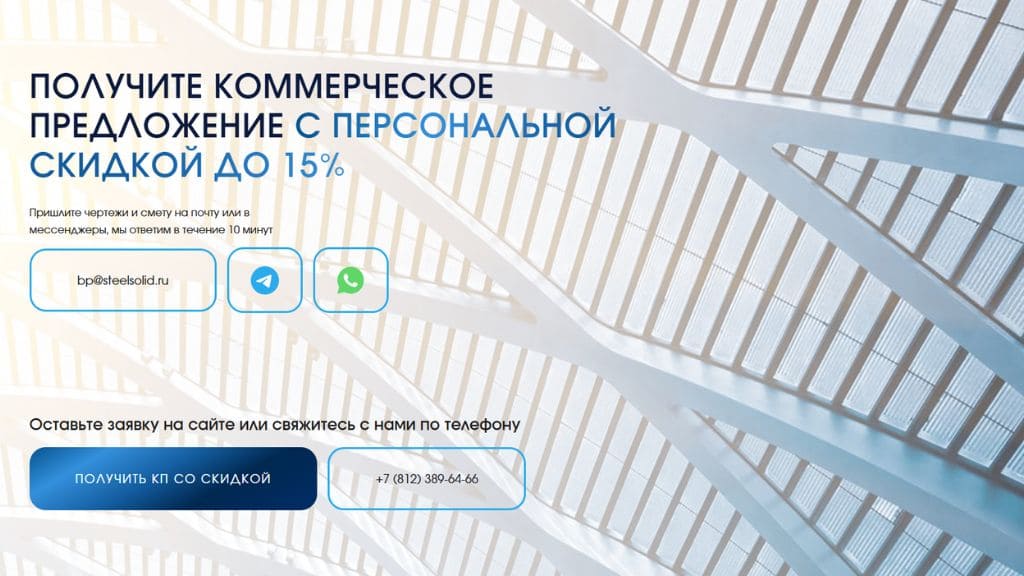 Здесь мы усиливаем главный призыв к действию - получение коммерческого предложения с персональной скидкой до 15%. Это прямая выгода, которая мотивирует клиента оставить заявку, даже если он ещё сомневался.