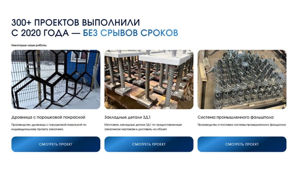 Здесь мы показываем факты, которые окончательно снимают сомнения у предпринимателя: с 2020 года компания выполнила более 300 проектов без срывов сроков. Это мощный аргумент, потому что в строительстве и производстве именно сроки часто решают всё.